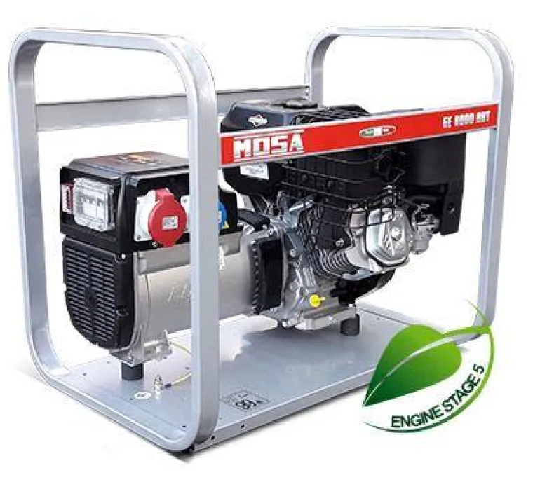 Mosa-agregaatti GE 8000 BBT, 8 kVA, 230/400 V. Kannettava ja monikäyttöinen aggregaatti. Briggs & Stratton -moottori, jossa sisäänrakennettu öljyvahti, joka ilmoittaa alhaisesta öljymäärästä.
