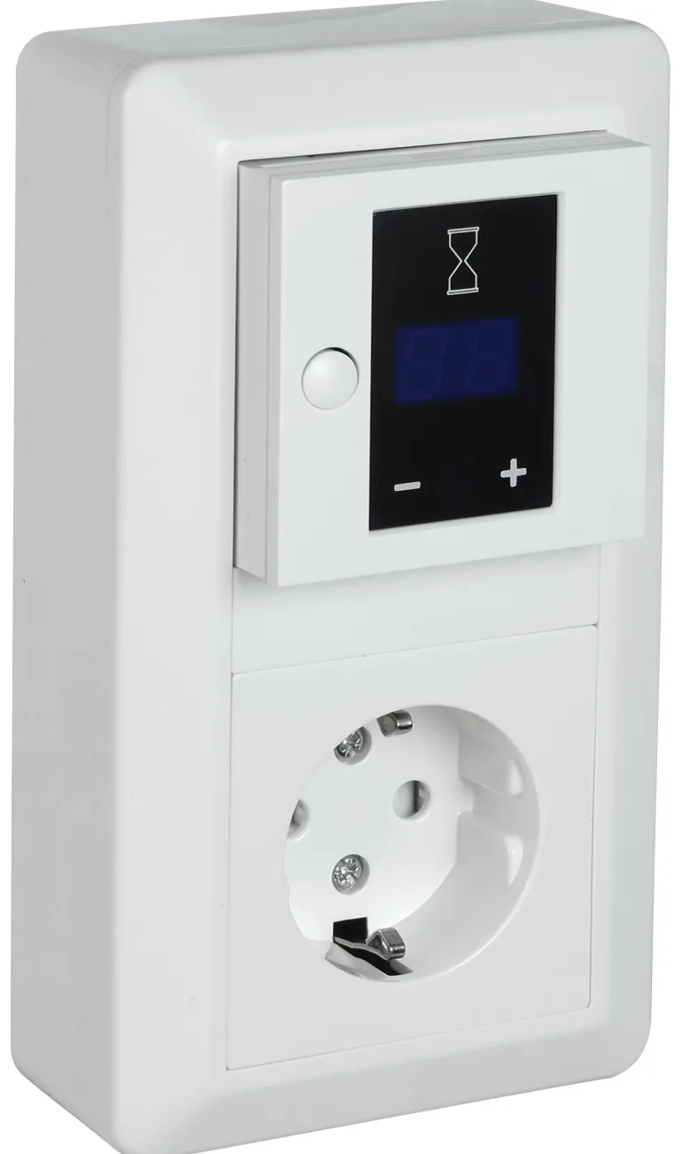 Elko EKO07086 on pinta-asennettava ajastinsarja, jonka näytössä näkyy jäljellä oleva aika ennen virran katkaisua. Mahdollisuus asettaa sekä enimmäis- että vähimmäisaikarajoitus. Asennussyvyys on 25 mm ja lyhin kytkentäjakso 1 min. Ohjelmoitavissa päällä/päällä tai päällä/pois päältä, valmistettu kestomuovista, kiiltävä pinta.