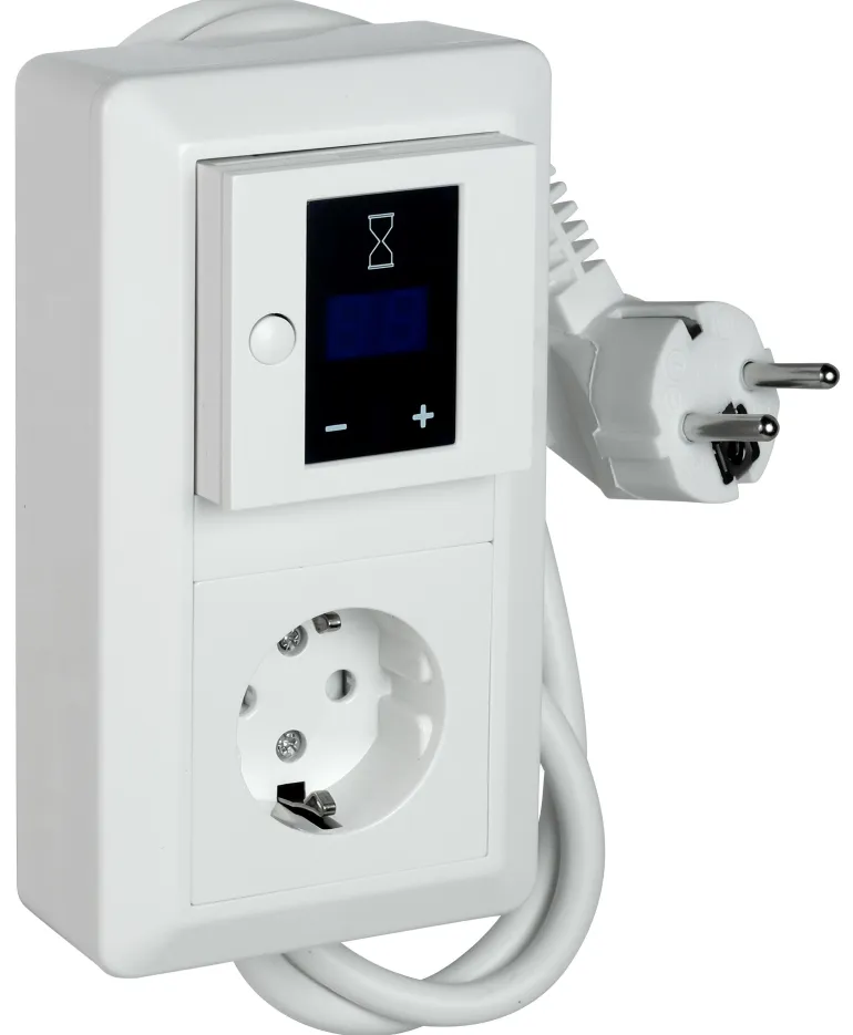 Ajastinsarja johdolla, pinta-asennukseen. Näyttö näyttää jäljellä olevan ajan ennen virran katkaisua. Ajastimen teho on 3600 W, nimellisjännite 230 V ja taajuusalue 50 Hz. Asennus ruuvilla ja tulo ulkoista ohjausta varten painikkeella. Valmistettu kestomuovista, kiiltävä pinta.