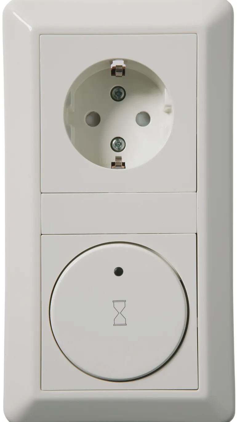 2-napainen ajastin valolla. Uppo- tai pinta-asennettava. 2-lokeroinen yhdistelmäkehys ja halogeenittomasta kestomuovista valmistetut keskiölevyt. Kiinnitysruuvien väli 60 mm. Asennetaan kahteen kojerasiaan, joiden c/c-etäisyys on 71 mm, tai kaksoisrasiaan. Pinta-asennettavassa versiossa mukana korotuskehys. Kytkentäaika 15 min – 8 h.