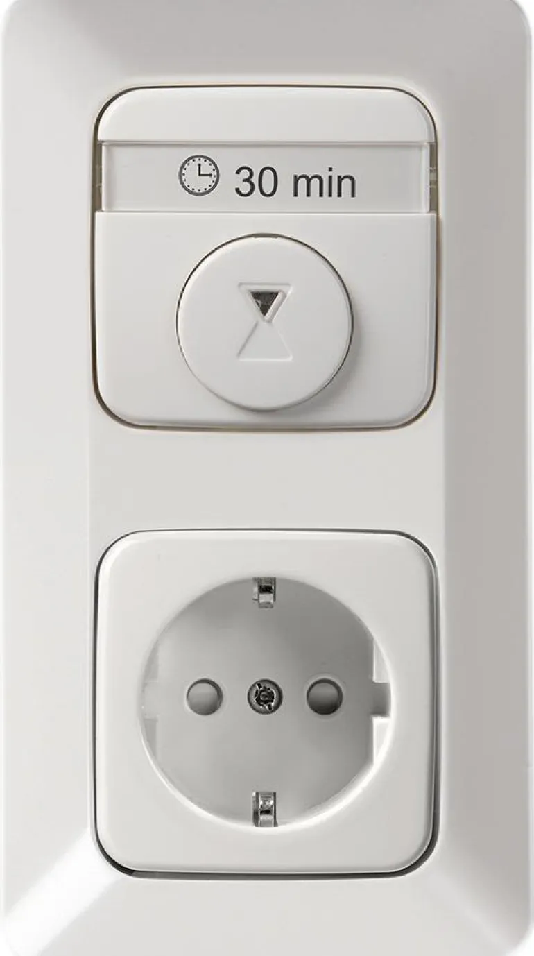 Ajastinsarja: Jussi-sarjan perusajastin, yksiosainen pistorasia ja kulmakotelo, upotettava. 2-napainen ajastin sähkölaitteiden kätevään ajanhallintaan.