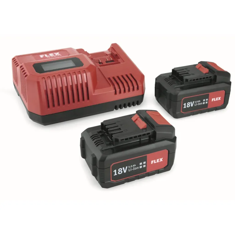 18 V -akkupaketti laturilla, joka sisältää 2 x 18 V 5,0 Ah -akkua ja laturin (10,8/18,0 V).