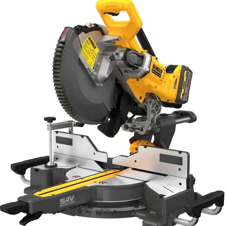 54V XR FlexVolt 305 mm:n akkukäyttöinen katkaisu- ja jiirisaha liukutoiminnolla. Mukana 2 x 9 Ah DCB547-akkua (18V/54V FlexVolt), 1 x DCB118-pikalaturi (Dewaltin 18V XR- ja XR FlexVolt Li-Ion -akuille) ja 60T XR Extreme Runtime 305 mm -terä. Jalusta ja takavaste on suunniteltu, työstetty ja tarkastettu tiukimpien tarkkuusstandardien mukaisesti, ja ne tarjoavat 0,1° tarkkuuden.