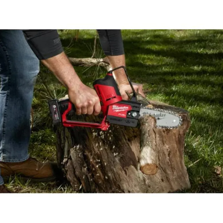 M12 FUEL™ HATCHET™ -akkuketjusahassa on voimaa katkaista 75 mm kovapuuta ja se mahdollistaa jopa 120 katkaisua yhden M12™ B4 -akun latauksella.