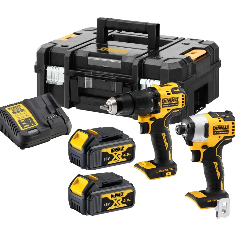 DEWALT DCK2062M2T-QW on akkukonesarja, joka sisältää akkuiskuporakoneen, iskevän akkuruuvinvääntimen, akkuja, laturin ja säilytyslaatikon.