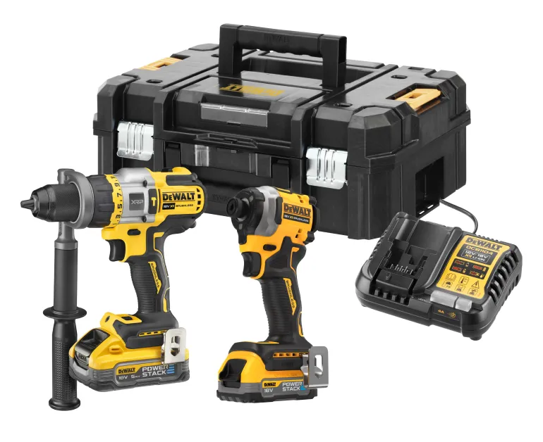 DEWALT DCK2052H1E1T-QW 18V XR on akkukonesarja, joka sisältää tehokkaan akkuiskuporakoneen, iskevän akkuruuvinvääntimen, akkuja, laturin ja säilytyslaatikon.