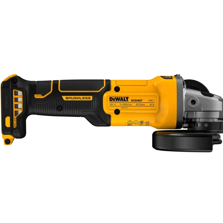 18V XR 125 mm DCG407 akkukulmahiomakone hiiliharjattomalla moottorilla ja liukukytkimellä. Kuormittamaton kierrosnopeus 0-9000 rpm, sopii erilaisiin sovelluksiin esim. metallin katkaisu ja hionta, kiillotus ja erilaisten pintojen hionta.