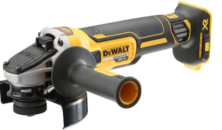 Dewalt DCG405N-XJ-akkukulmahiomakone hiiliharjattomalla moottorilla. Elektroninen kytkin vähentää takapotkua laikan mahdollisesti jumiutuessa ja elektroninen jarru varmistaa, että laikka pysähtyy nopeasti ja turvallisesti kun kytkin on vapautettu.