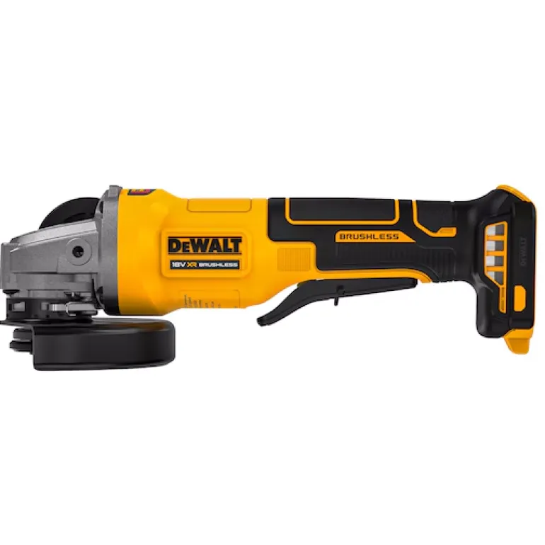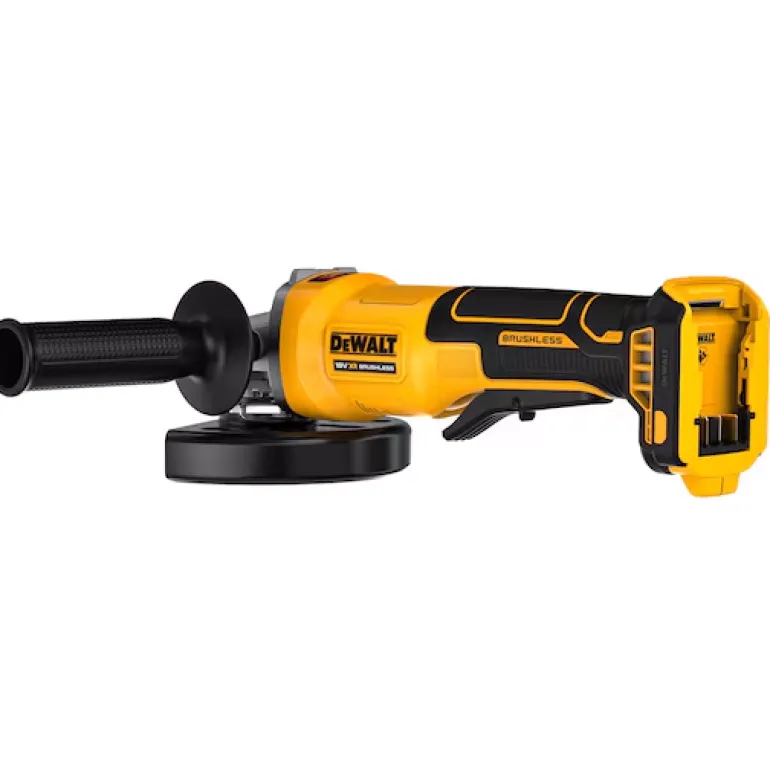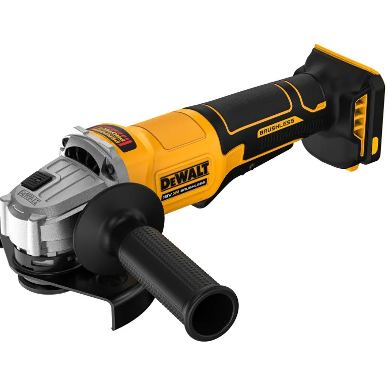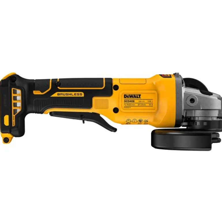 18V XR 125 mm DCG408 akkukulmahiomakone hiiliharjattomalla moottorilla ja painokytkimellä (ei portaaton nopeudensäätö, Paddle Switch-painokytkin – virta katkeaa, kun ote irrotetaan). Kuormittamaton kierrosnopeus 9000 rpm, sopii erilaisiin sovelluksiin esim. metallin katkaisu ja hionta, kiillotus ja erilaisten pintojen hionta.