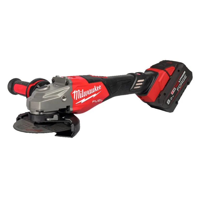 MILWAUKEE M18 FUEL™ 125 mm kulmahiomakone jarrulla ja liukukytkimellä, joka tuottaa 1800 W:n kulmahiomakonetta vastaavan tehon. RAPIDSTOP™ pysäyttää laikan alle 2 sekunnissa suojaten käyttäjää. AVS-sivukahva vähentää tärinää. Integroitu FIXTEC™-järjestelmä mahdollistaa työkaluttoman laikan vaihtamisen. Turvakytkin jälleenkäynnistymissuojalla estää vahinkokäynnistymisen. Kierrosluku ilman kuormitusta 0-9000 rpm. 125 mm laikansuoja mahdollistaa parhaan katkaisukapasiteetin ja työkaluttoman suojan säätämisen. Paino akun kanssa 3,5 kg (8,0 Ah). Mukana 2 x 8,0 Ah M18 REDLITHIUM FORGE™ -akkua, M12-18 FC -laturi ja HD-laukku.