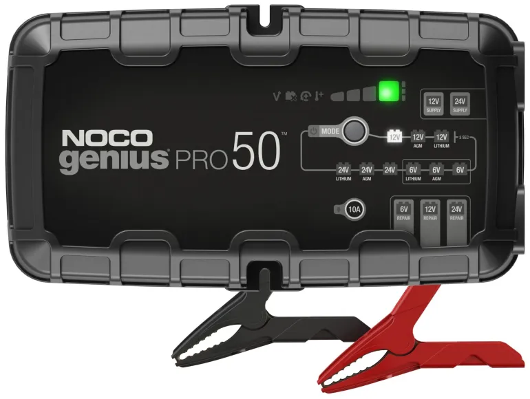 Noco GENIUSPRO50 on 6-, 12- ja 24-voltin (50 A) täysin automaattinen älylaturi akkujen lataukseen ja ylläpitolataukseen, joka toimii myös virtalähteenä ja desulfaattorina. 50 ampeerin laturiksi luokiteltu GENIUSPRO50 on varustettu lämpötilan kompensoinnilla ja sopii kaikentyyppisille auto-, vene- ja syväsyklisille akuille. Laturi on suunniteltu ammattikäyttöön, jossa tarvitaan korkealaatuista toimintavarmuutta ja suorituskykyä.