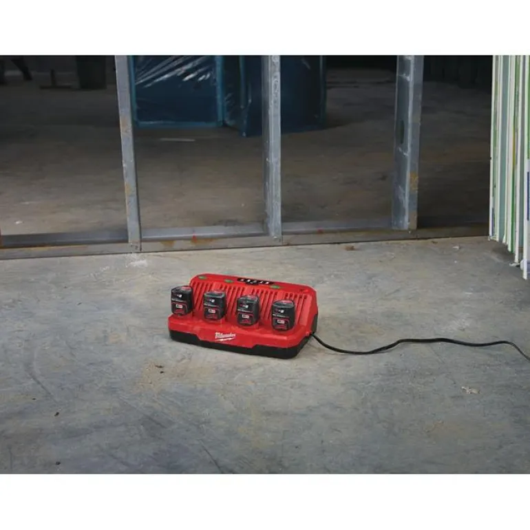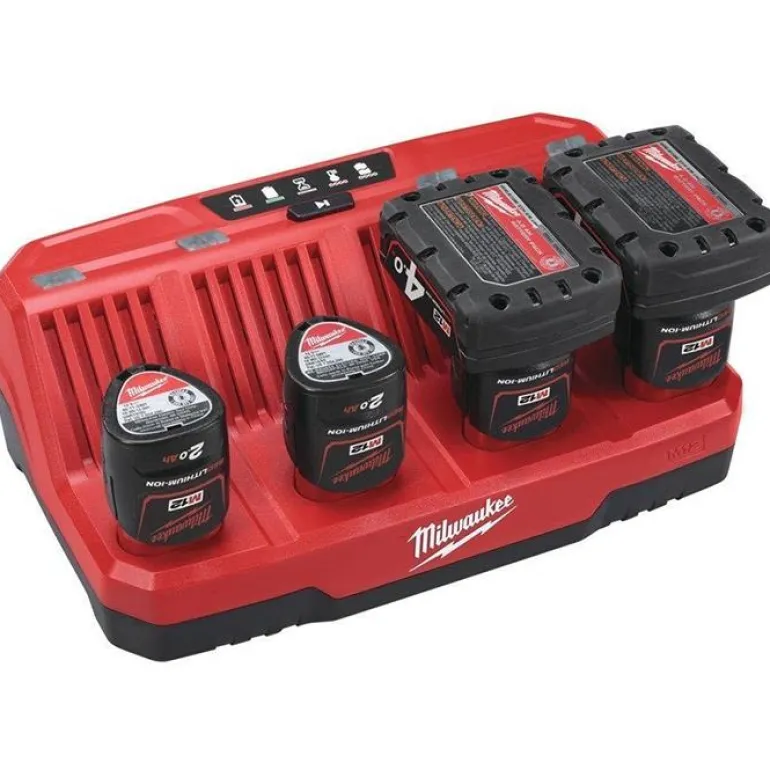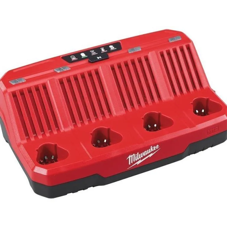 Milwaukee M12 C4 on 4-pistelaturi Milwaukeen 12 V:n litiumioniakuille. Lataa jopa 4 akkua vuorollaan järjestyksessä.