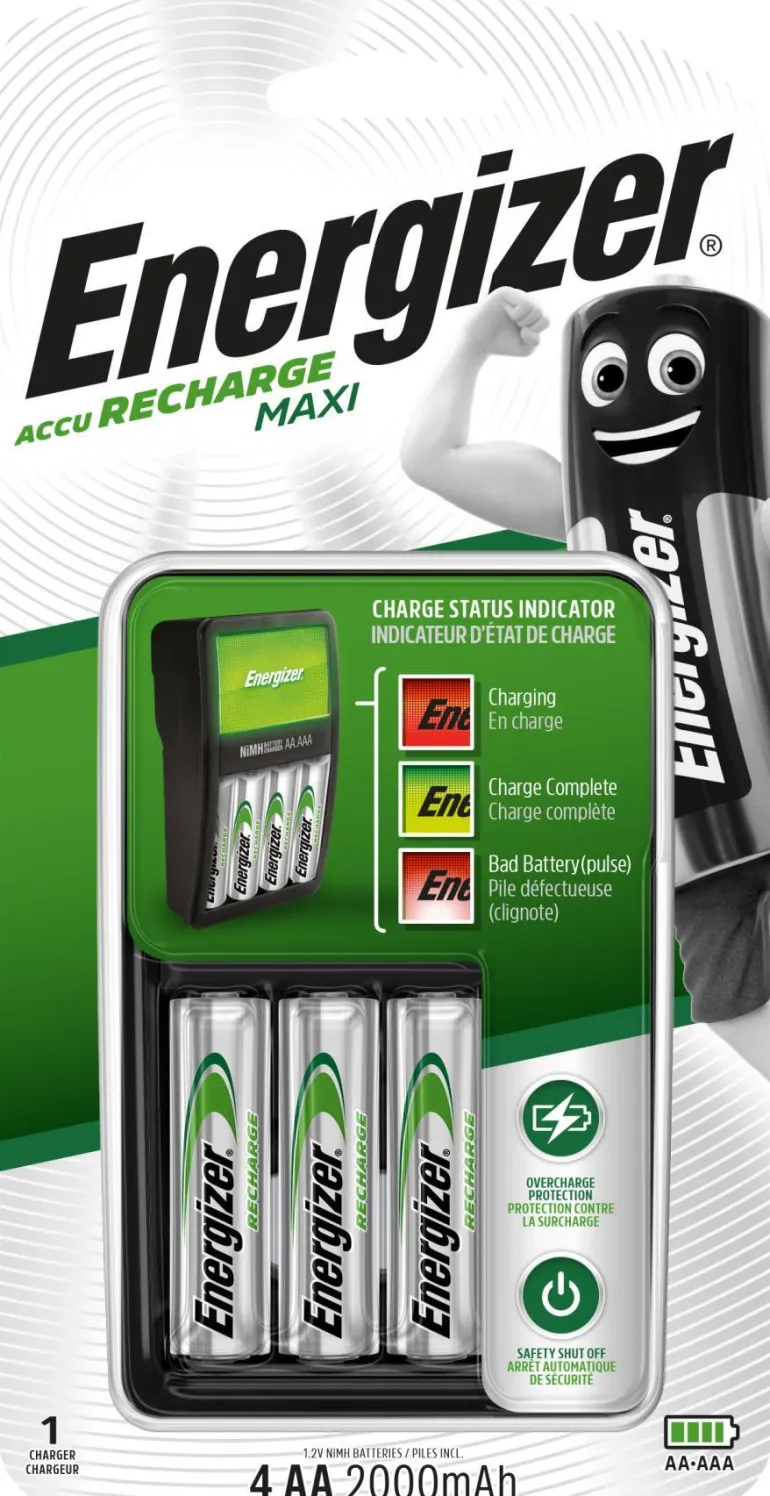 Energizer Recharge MAXI -paristolaturin mukana toimitetaan 4 AA-paristoa, joiden kapasiteetti on 2000 mAh.