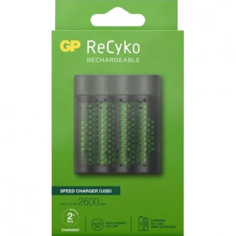 Pakkauksessa neljä 2600 mAh AA-akkua. Ladattava, toimii kaikentyyppisten GP ReCyko -latausasemien kanssa. Rei’itetyn kannen ansiosta ReCyko Speed M451 laturi toimii tyylikkäänä akkukotelona, joka pitää akut suojattuna kotona tai tien päällä.