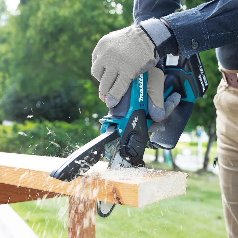 Makita DUC101 on kompakti akkuoksasaha, jossa on 10 cm:n laippa, automaattinen teräketjun voitelu ja elektroninen jarru. 8 m/s ketjunopeus helpottaa oksien ja pienemmän puutavaran sahaamista.