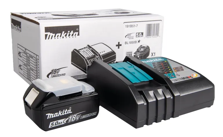 Makita 191B51-7 PowerPack LXT® -akku- ja laturipaketti, joka sisältää 18 V 5,0 Ah -akun varaustilan näytöllä sekä pikalatauslaitteen. Akun suojausjärjestelmä suojaa ylikuormitusta, alijännitettä ja ylikuumentumista vastaan.