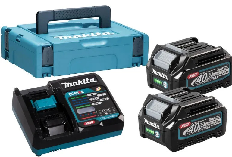 Makita 191J81-6 PowerPack XGT® -akku- ja laturipaketti, joka sisältää 2 x 40 V 2,5 Ah XGT BL4025 -akkua, DC40RA -pikalatauslaitteen ja säilytyslaukun. Pikalatauslaite DC40RA lataa akun täyteen 28 minuutissa. Akun suojausjärjestelmä suojaa ylikuormitusta, alijännitettä ja ylikuumentumista vastaan.