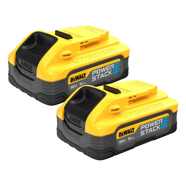 Tuplapakkaus 18V XR POWERSTACK™ 5 Ah -akkuja, jotka hyödyntävät uusinta pouch cell -akkukennoteknologiaa ja soveltuvat vaativiin sovelluksiin korkean suorituskyvyn ansiosta.