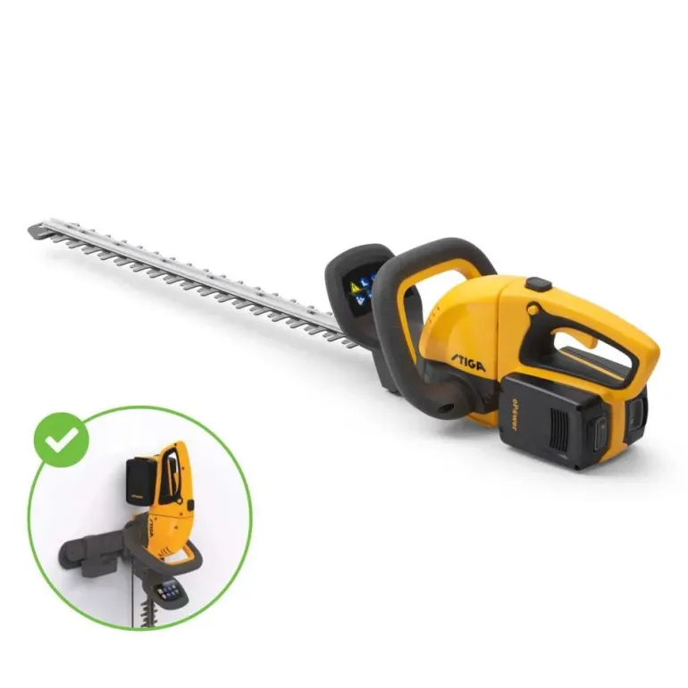 Kaksi ePower 20V -akkua voidaan ladata suoraan laitteessa upouuden STIGA-latausjärjestelmän avulla. Säilytysjärjestelmän (sisältyy) avulla voit ripustaa työkalun seinälle sekä säilytystä että latausta varten.