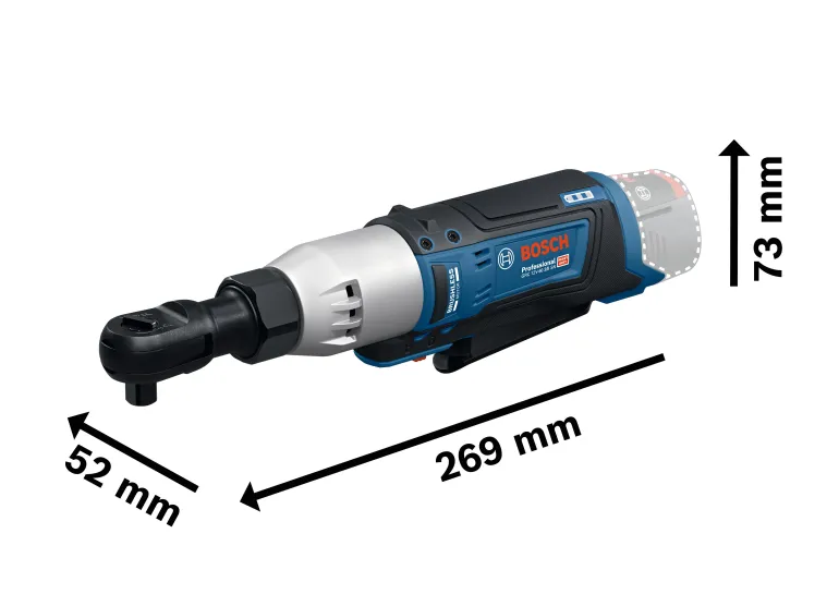 GRC 12V-60 3/8 SN -räikkäavain soveltuu ahtaissa tiloissa olevien kiinnitystarvikkeiden löysäämiseen ja kiristämiseen. Se on yhteensopiva kaikkien 12 V:n Bosch Professional -akkujen kanssa.