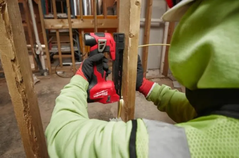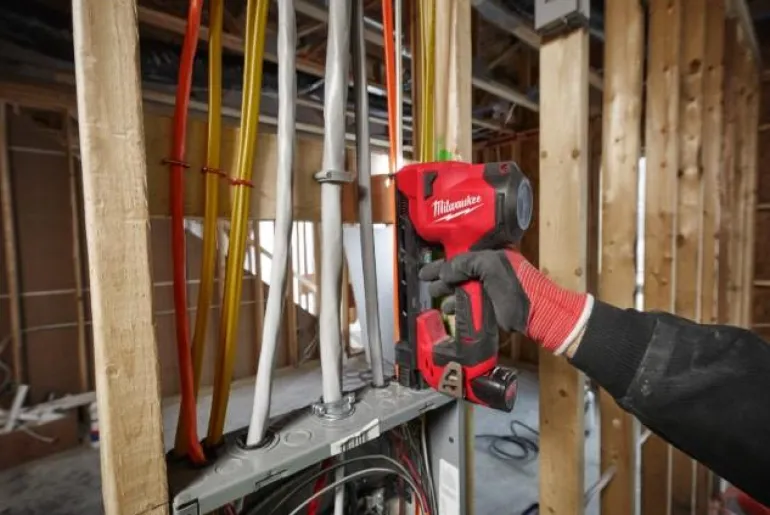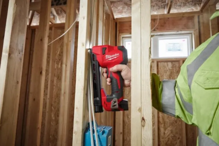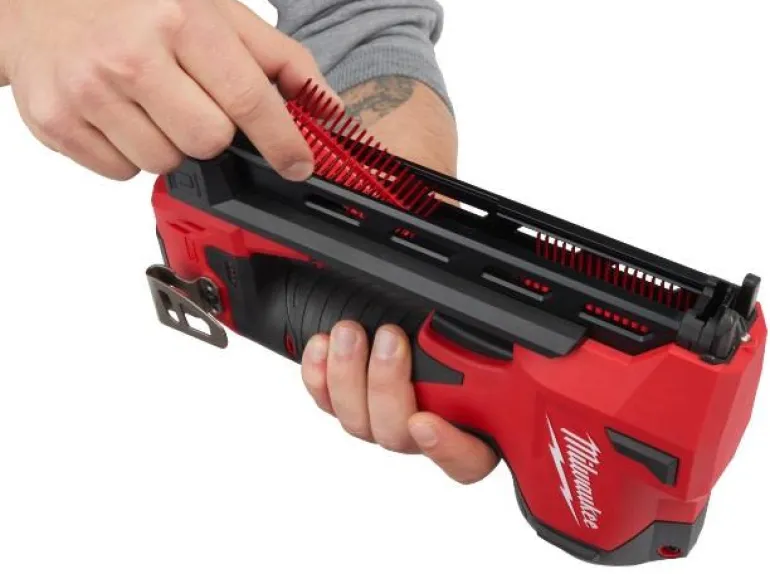 Milwaukee M12™ -akkusinkilänaulain kaapeleille, joka on kaksi kertaa nopeampi kuin manuaalinen vastaava työkalu. Siirrettävät kaapeliohjaimet varmistavat sinkilän kohdistuksen erikokoisten kaapelien päälle.