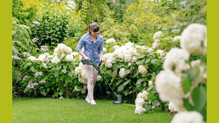 Sen kahvan yläosassa olevan EdgeSimple-toimintopainikkeen avulla voit vaihtaa kätevästi nurmikon viimeistelystä reunojen leikkaukseen painamalla nappia ja kääntämällä työkalun pään reunaleikkuuasentoon. Työkalun puoliautomaattinen kela syöttää lankaa napin painalluksella. Akun ollessa täyteen ladattu trimmeri pystyy leikkaamaan kuuden tenniskentän reunat. Työkalu kuuluu POWER FOR ALL ALLIANCE -järjestelmään. Yhdellä akulla voi käyttää monia erimerkkisiä työkaluja.
