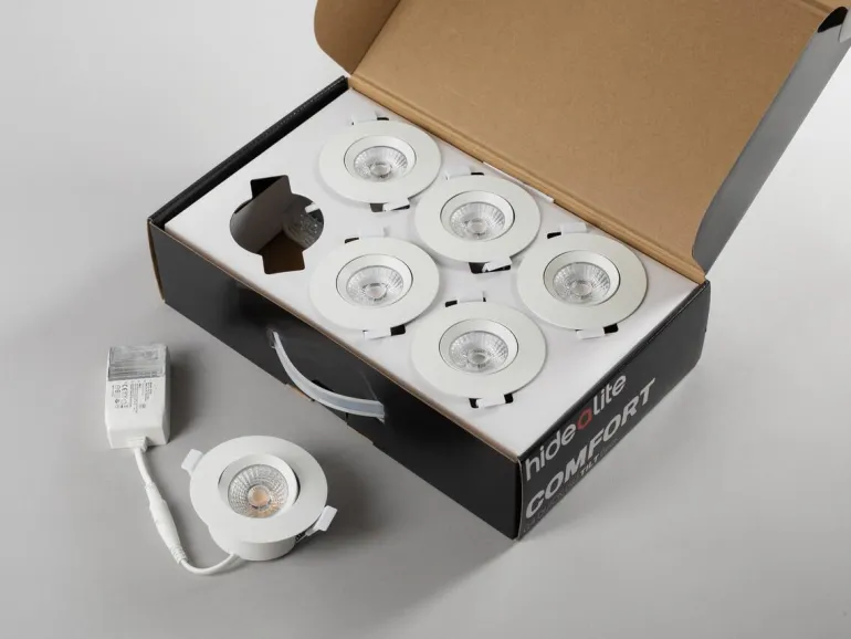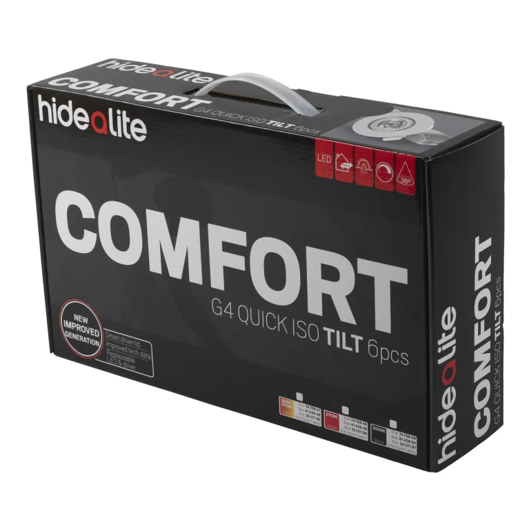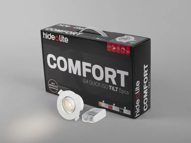 Hide-a-lite Comfort G4 Quick ISO Tilt on alasvalo linssitekniikalla, sillä on suuri valomäärä sekä ISO-kupu. Hyväksytty asennukseen suoraan eristettä vasten. Matalarakenteinen, sopii täydellisesti 28 mm:n harvalaudoitukselle ja 13 mm:n kipsilevylle. Moduulijärjestelmän ansiosta voit helposti purkaa valaisimen osiin ja säästää aikaa jos valonlähde on vaihdettava. Helppo asentaa ja erittäin hyvä värintoisto, Ra>95. Soveltuu sisälle ja ulos. Suunnattava (30°) versio on täydellinen valaisin kaltevaan kattoon. Liitäntälaite on varustettu kannella, joka voidaan ilman työkaluja mukauttaa kaapelille tai taipuisalle 16 mm suojaputkelle. 3-napainen pikaliitin ketjutusta ja vedonpoistoa varten. Valaisin voidaan himmentää markkinoiden tavallisimmilla himmentimillä. Kätevä 6-pakkaus.