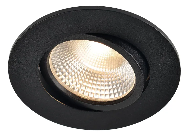 Musta suunnattava alasvalo (IP65-luokiteltu). Valaisin soveltuu erityisesti kosteisiin tiloihin, rakennusten ulkopinnoille, räystäisiin, harvalaudoituksiin ja terassien kattorakenteisiin.