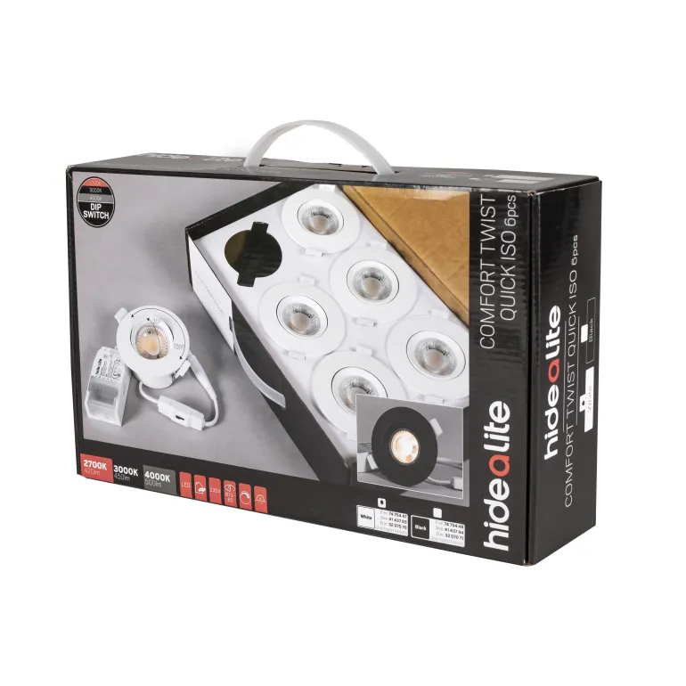 Hide-a-lite Comfort Twist Quick ISO 6-pack on kätevä 6-pakkaus himmennettäviä ja monitoimisia 230V -yleisalasvaloja Comfort-linssillä. Twist-toiminnon ansiosta sitä voidaan kiertää 2×150° ja valaisinkehystä kallistaa 30° – sopii erinomaisesti, kun haluat suunnata valon tai asentaa sen esimerkiksi avoimeen kattorakenteeseen. Värilämpötila valittavissa ColourTemp-DIP-kytkimellä suoraan valaisimessa. IP44-valaisin, joka soveltuu sisä- ja ulkokäyttöön. Voidaan asentaa suoraan eristettä vasten, 28 mm harvalaudoitukseen ja 13 mm kipsilevyyn. Mukana himmennettävä liitäntälaite, 3-napainen pikaliitin ketjutusta varten sekä vedonpoisto kaapelille tai taipuisalle 16 mm:n suojaputkelle. Himmennettävissä markkinoiden tavallisimmilla himmentimillä. Saatavana mustana tai valkoisena.