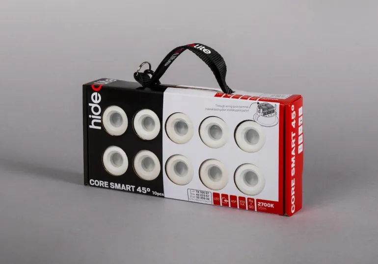Hide-a-lite Core Smart 45° 10-pack on upea pienoisalasvalosetti 10 kpl pakkauksessa, mukana karbiinihaka työhousuihin tai tikkaisiin kiinnittämistä varten. Integroitu pikaliitin helppoon ja kätevään sarjaankytkentään, poistaa ulkoisten jatkoliitosten tarpeen, minimoi virhemahdollisuudet ja yksinkertaistaa vianetsintää. Soveltuu upotettuna asennettavaksi ikkunasyvennyksiin ja kalusteisiin tai pinta-asennukseen Core Smart -korotusrenkaan avulla. Säästä aikaa ja pakkausmateriaalia.
