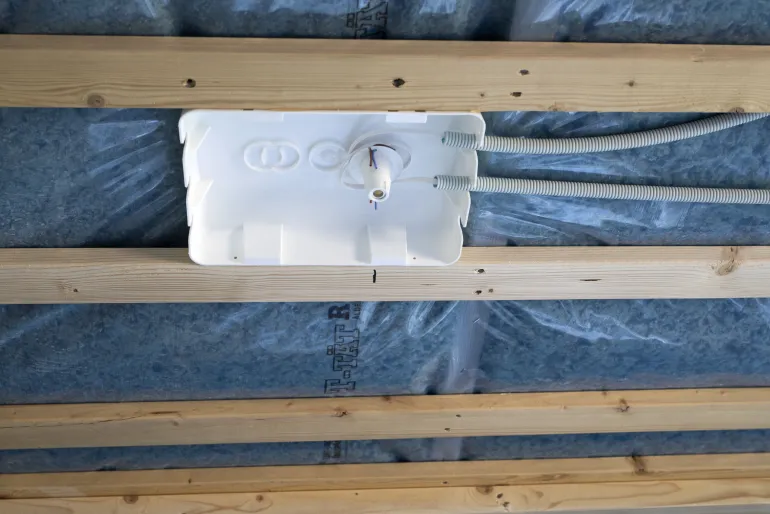 Kun Spot Finder on Spot Guard Glesissa, voidaan helpolla ja nopealla magneettietsinnällä löytää oikea paikka reikien poraamiselle, kun katto on valmis. Johdot voi kiertää kelalle niin, että ne eivät jää puristuksiin kipsilevyn Spot Guard Glesin väliin eivätkä osu poranterään