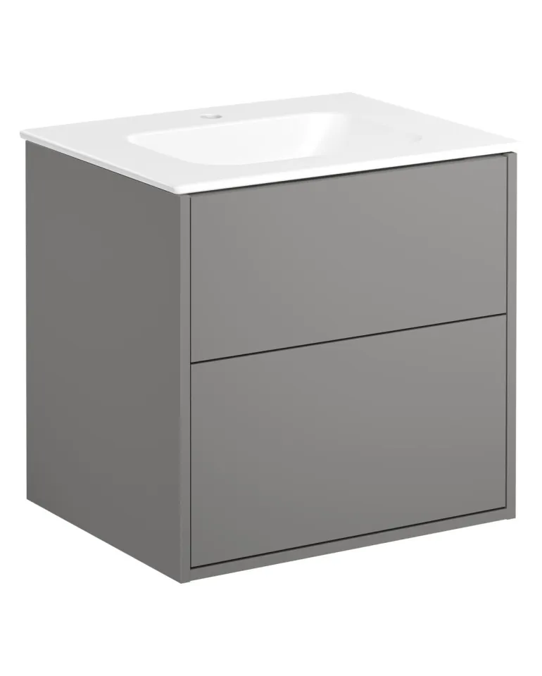 Pesuallaskaappi valkoinen, jossa mattavalkoinen täysin katettu, ohut posliininen pesuallas kahdella hanareiällä. Asennusjärjestelmä, jonka avulla asennus ja säätö on helppoa ja nopeaa.