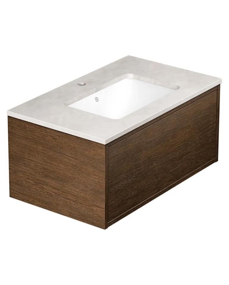 Gustavsbergin Ducentic -pesuallaskaappi keraamisella allastasolla ilman tukikehystä. Tasossa reikä yhdelle yksireikäiselle hanalle.