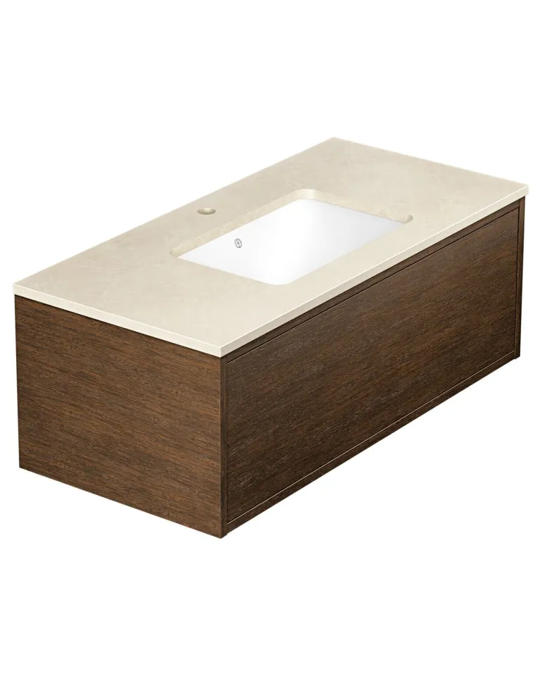 Gustavsbergin Ducentic -pesuallaskaappi kivitasolla ja ilman tukikehystä. Tasossa reikä yhdelle yksireikäiselle hanalle.