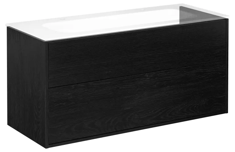 Musta pesuallaskaappi, jossa kaksi laatikkoa, ilman pesuallasta, 120 cm. Hiljaisesti ja pehmeästi sulkeutuvat, täysin ulosvedettävät vetolaatikot, joissa kaikki tarvikkeet ovat hyvin näkyvillä.
