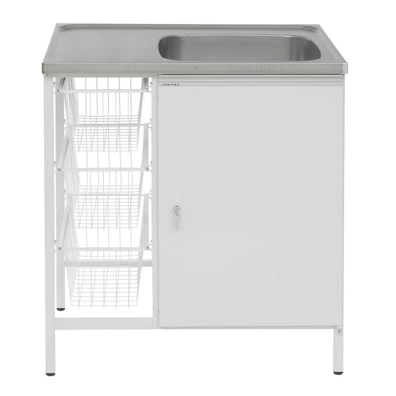 Allaskaappi, jossa ruostumattomasta teräksestä valmistettu ja altaalla varustettu pesupöytä, lukittava ja lapsiturvallinen säilytyskaappi sekä kolme muovipinnoitettua verkkokoria. Mukana lisäksi koripohjaventtiili ja poistoputki.