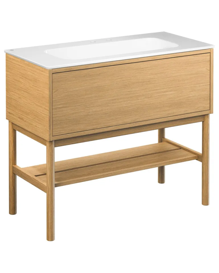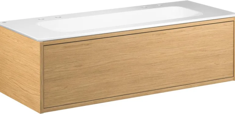 Gustavsbergin Ducentic -pesuallaskaappi keraamisella tai kivisellä allastasolla. Valittavissa myös tukikehyksellä tai ilman sekä yhdellä tai useammalla hanareiällä. Tasossa/pesualtaassa on kaksi hanareikää yhtä kaksireikäistä hanaa varten.