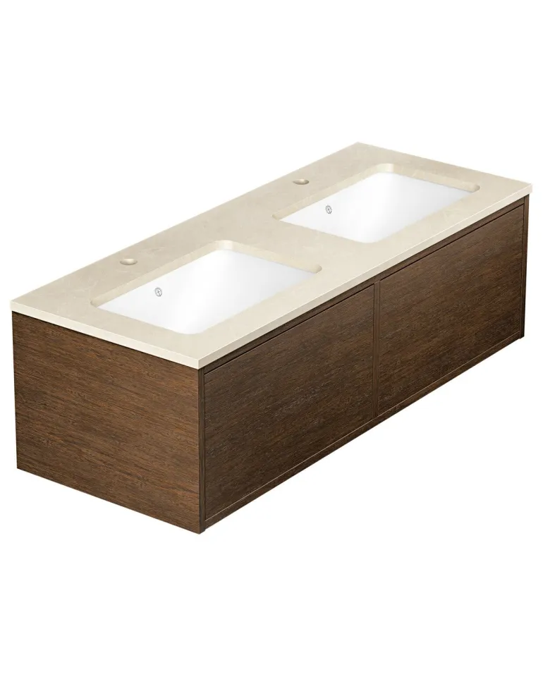 Gustavsbergin Ducentic -pesuallaskaappi keraamisella tai kivisellä allastasolla. Valittavissa myös tukikehyksellä tai ilman sekä yhdellä tai useammalla hanareiällä. Pesualtaassa on kaksi pesuallasta ja kaksi hanareikää (1+1) kahdelle yksireikäiselle hanalle.