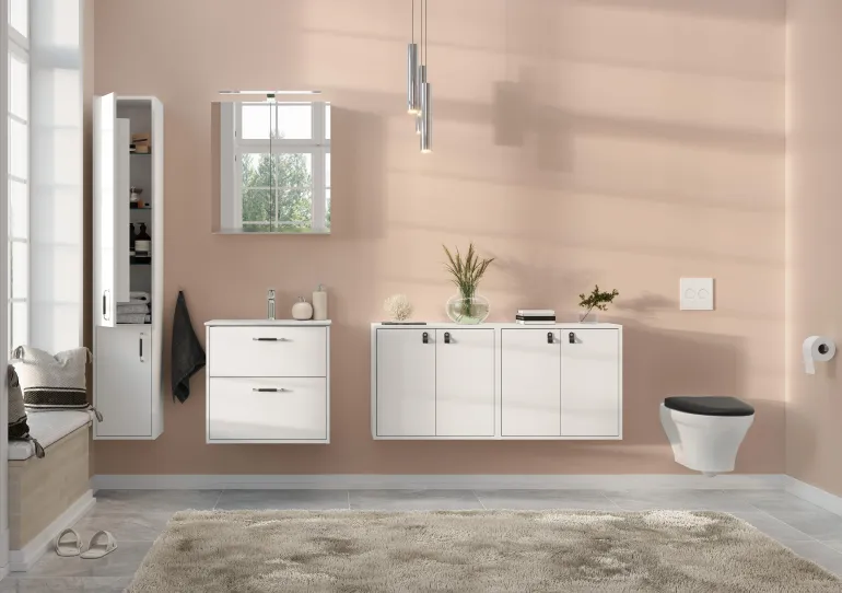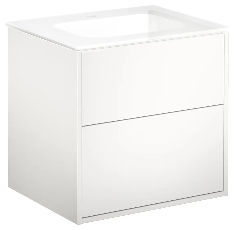 Valkoinen pesuallaskaappi kahdella laatikolla, ilman pesuallasta, 60 cm. Hiljaisesti ja pehmeästi sulkeutuvat, täysin ulosvedettävät vetolaatikot, joissa kaikki tarvikkeet ovat hyvin näkyvillä.