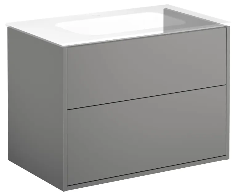 Tuhkanharmaa pesuallaskaappi kahdella laatikolla, ilman pesuallasta, 80 cm. Hiljaisesti ja pehmeästi sulkeutuvat, täysin ulosvedettävät vetolaatikot, joissa kaikki tarvikkeet ovat hyvin näkyvillä.
