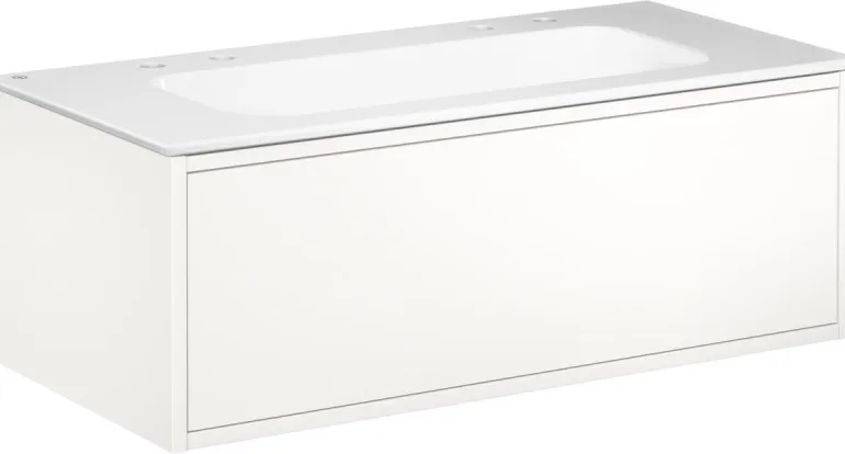 Gustavsbergin Ducentic -pesuallaskaappi keraamisella tai kivisellä allastasolla. Valittavissa myös tukikehyksellä tai ilman sekä yhdellä tai useammalla hanareiällä. Pesualtaassa on kaksi pesuallasta ja kaksi hanareikää (1+1) kahdelle yksireikäiselle hanalle.