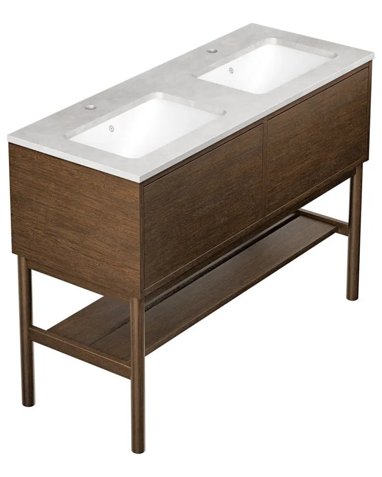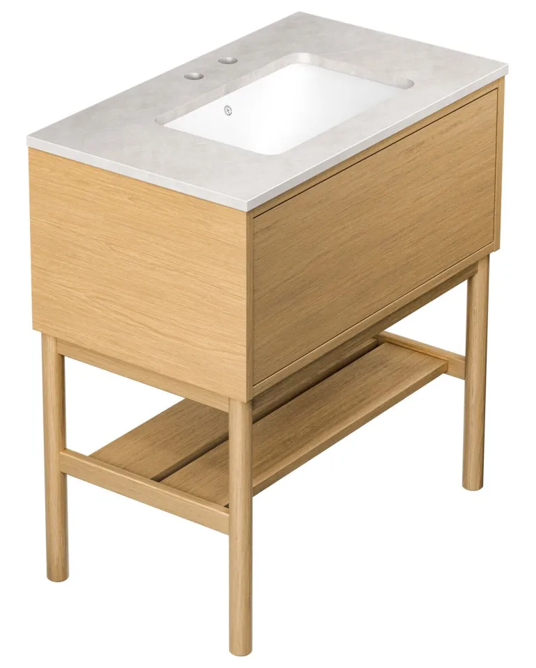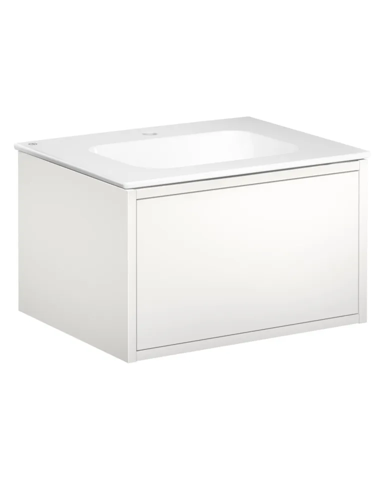 Gustavsbergin Ducentic -pesuallaskaappi keraamisella allastasolla ja tukikehyksellä. Tasossa reikä yhdelle yksireikäiselle hanalle.