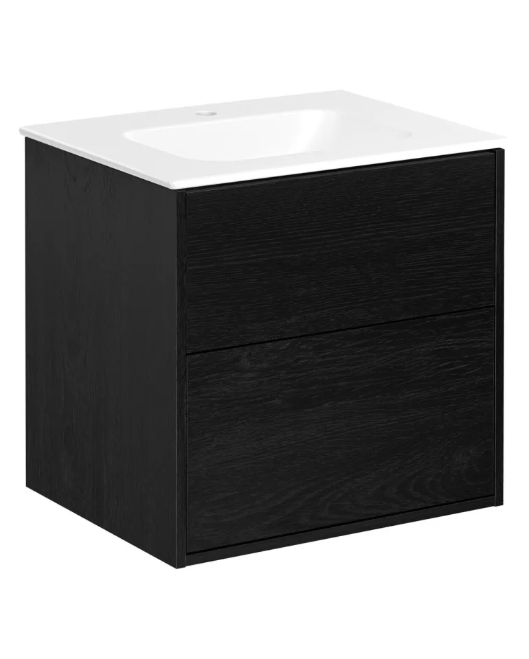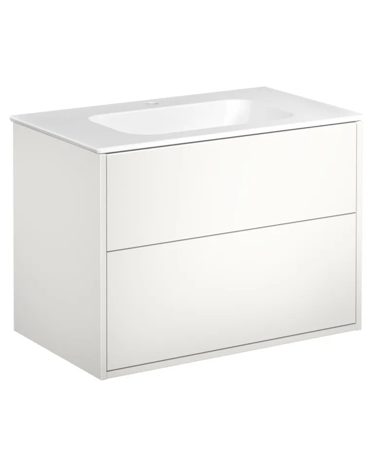 Pesuallaskaappi tuhkanharmaa, jossa mattavalkoinen täysin katettu, ohut posliininen pesuallas kahdella hanareiällä. Asennusjärjestelmä, jonka avulla asennus ja säätö on helppoa ja nopeaa.