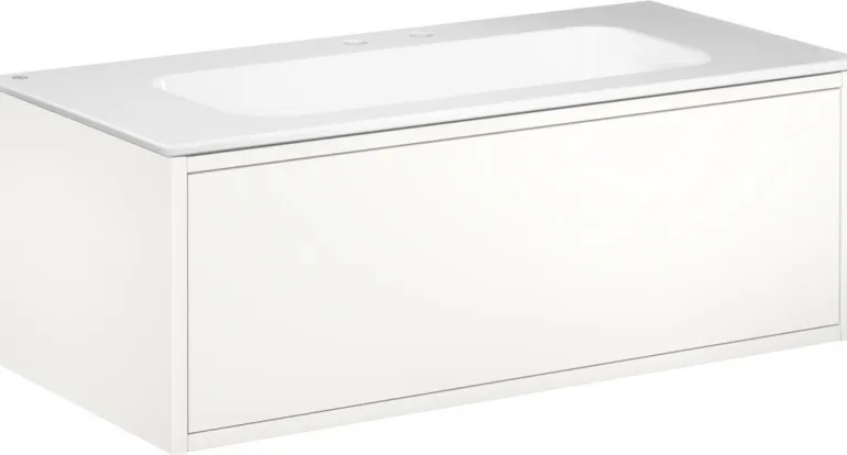 Gustavsbergin Ducentic -pesuallaskaappi keraamisella tai kivisellä allastasolla. Valittavissa myös tukikehyksellä tai ilman sekä yhdellä tai useammalla hanareiällä. Pesualtaassa on kaksi hanareikää (1+1) kahdelle yksireikäiselle hanalle.