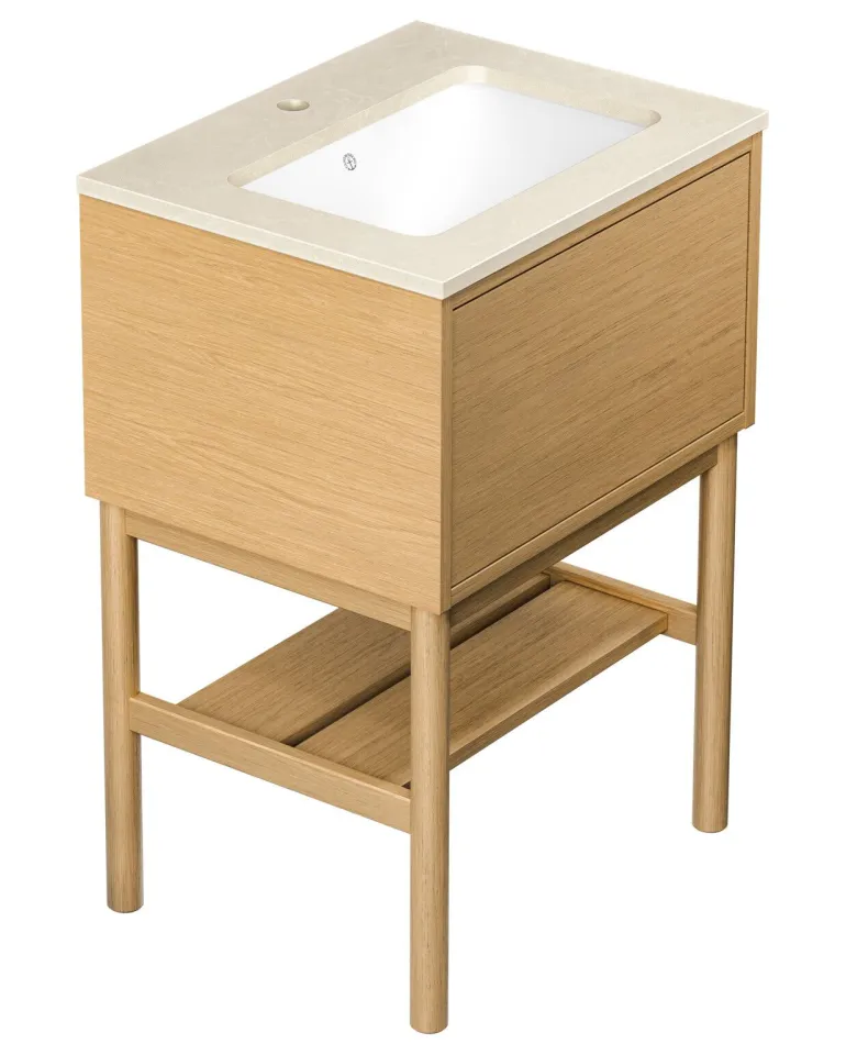 Gustavsbergin Ducentic -pesuallaskaappi kivitasolla ja ilman tukikehystä. Tasossa reikä yhdelle yksireikäiselle hanalle.