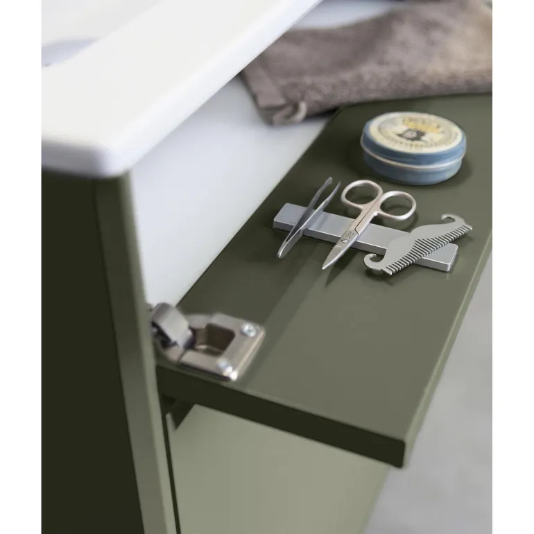 Pesuallaskaappi (100 cm) kokoleveällä pesualtaalla ja pehmeästi ja hiljaisesti sulkeutuvilla laatikoilla. Kapea syvyyssuunnassa, ja mahtuu näin hyvin pienempäänkin kylpyhuoneeseen. Materiaali kylpyhuoneisiin tarkoitettua kosteudenkestävää MDF-levyä.