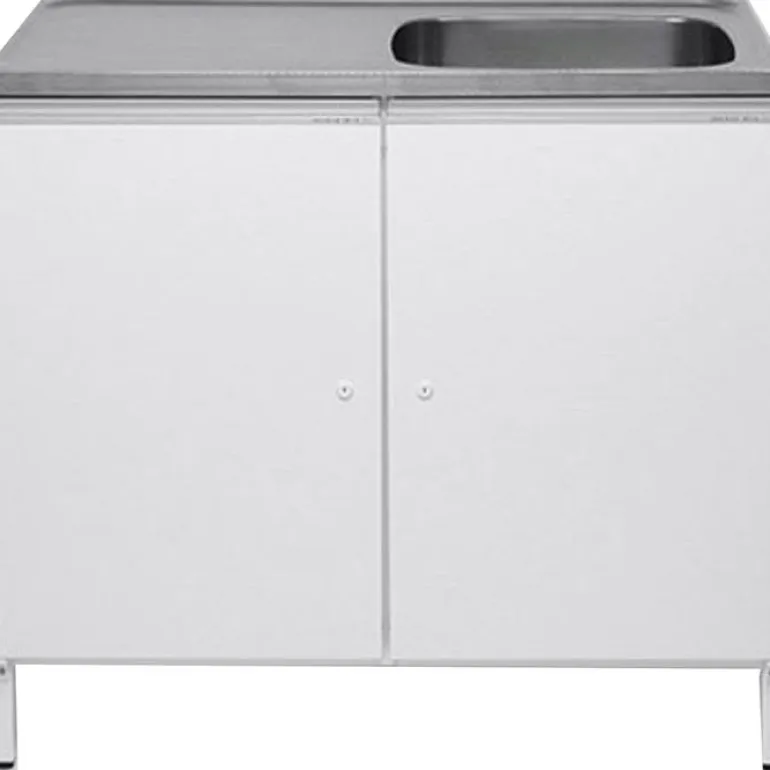 Valkoinen allaskaappi, jossa on kaksi lukittavaa, lapsiturvallista säilytyskaappia. Kuvioitu pöytätaso ruostumatonta terästä ja suuri pesuallas. Kaapin lukittavat ovet voidaan helposti vaihtaa oikealta vasemmalle saranoiduksi. Mukana tulee jauhemaalatusta pellistä valmistettu jalusta, jossa on säädettävät muoviset jalat.