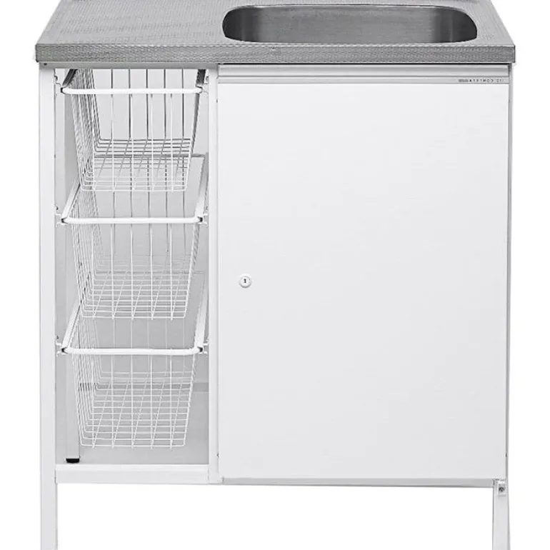 Valkoinen allaskaappi, jossa säilytyskaappi ja kolme muovipinnoitettua lankakoria. Kuvioitu pöytätaso ruostumatonta terästä ja suuri pesuallas. Kaapin lukittava ovi voidaan helposti vaihtaa oikealta vasemmalle saranoiduksi. Mukana tulee jauhemaalatusta pellistä valmistettu jalusta, jossa on säädettävät muoviset jalat.