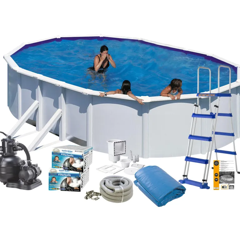 Uima-allaspaketti perheeseen, jossa ei ole aivan pieniä lapsia. Sisältää kaikki tarvikkeet erillisen uima-altaan asentamiseen puutarhaan tai kesämökille. Uima-allas on valkoinen ja soikea, ja sen mitat ovat 7,3 x 3,75 m ja korkeus 1,20 metriä, mikä tarjoaa runsaasti tilaa erilaisille vesileikeille. Moninkertaisesti käsitellyt terässeinämät kestävät pohjoismaisen ilmaston.