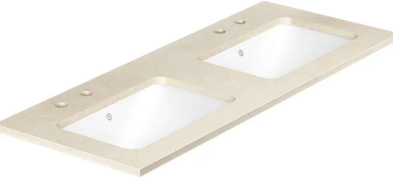 Ducentic-kivitaso 120 cm on komposiittikivestä valmistettu taso, jossa on kaksi alta asennettavaa allasta. Sopii Ducentic -allaskaappeihin. Neljä hanareikää kahdelle kaksireikäiselle pesuallashanalle. Väri beige.